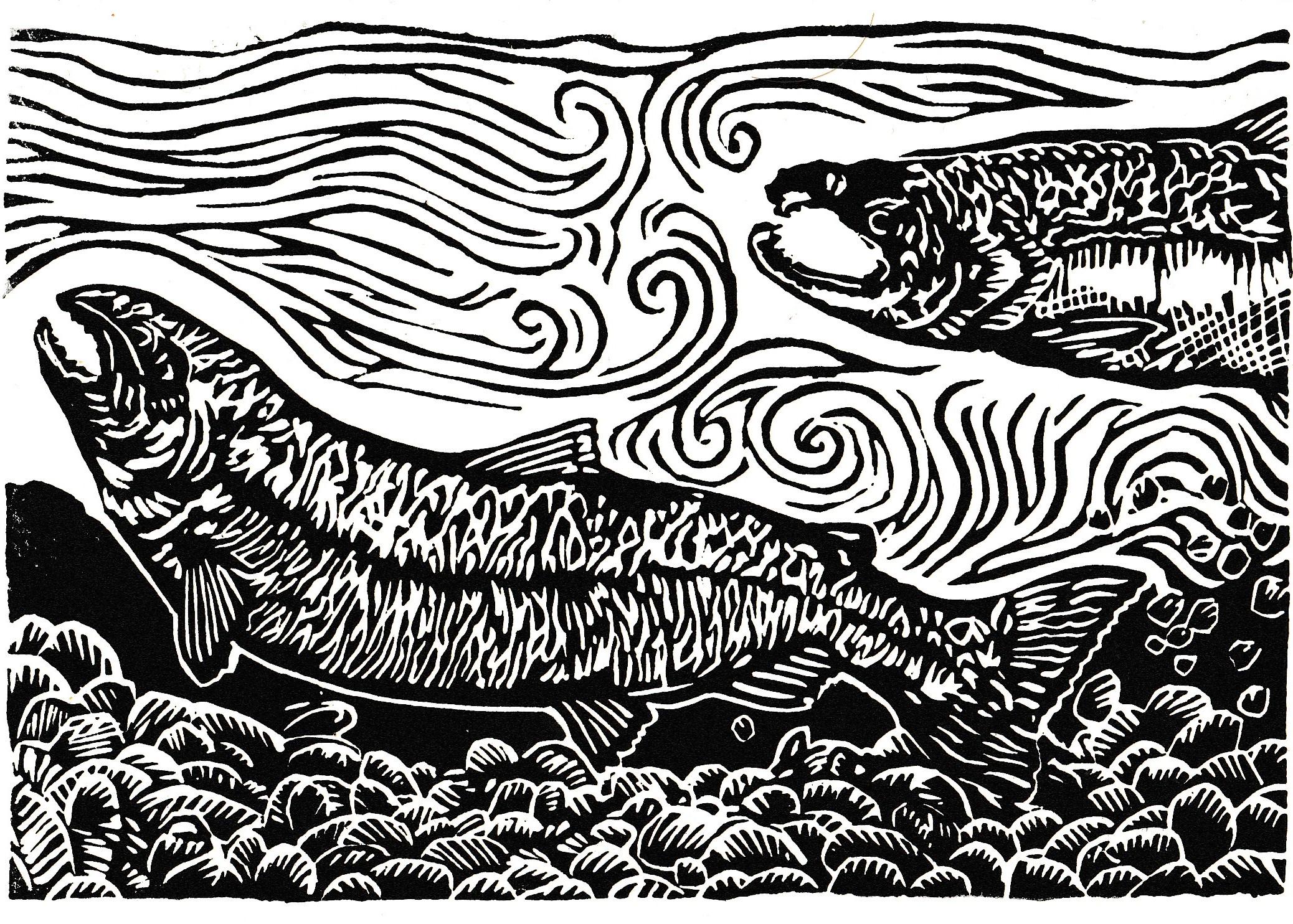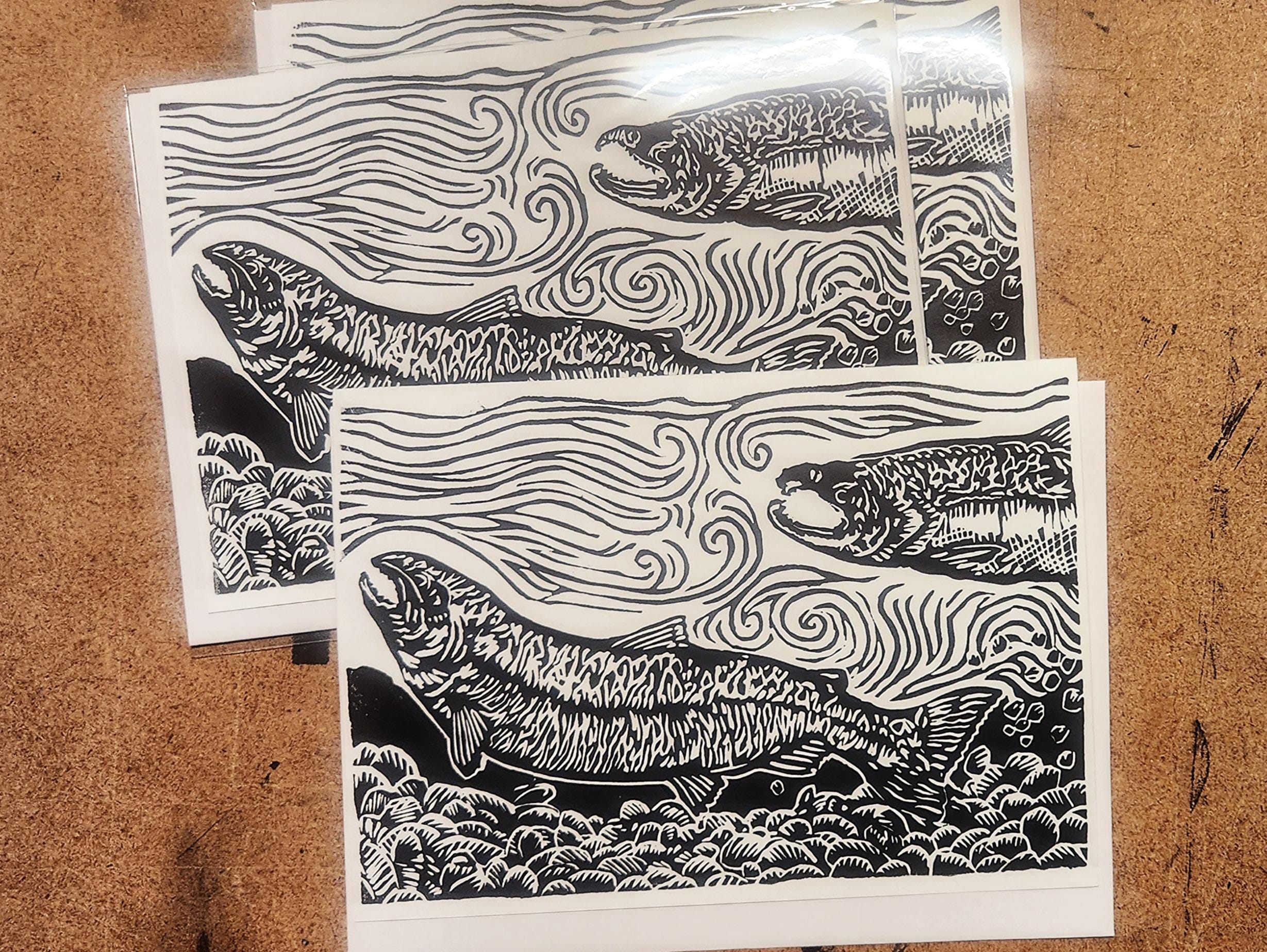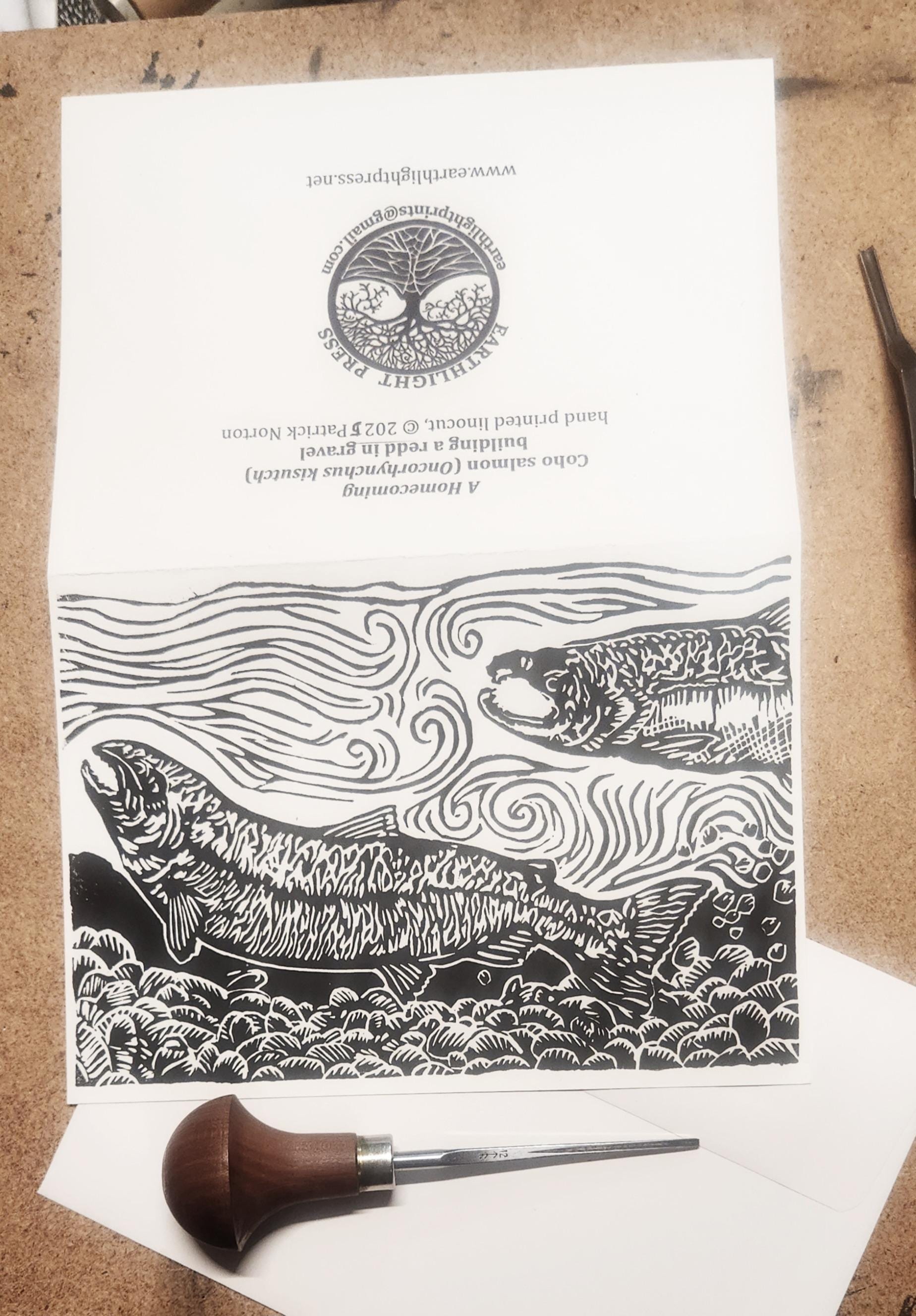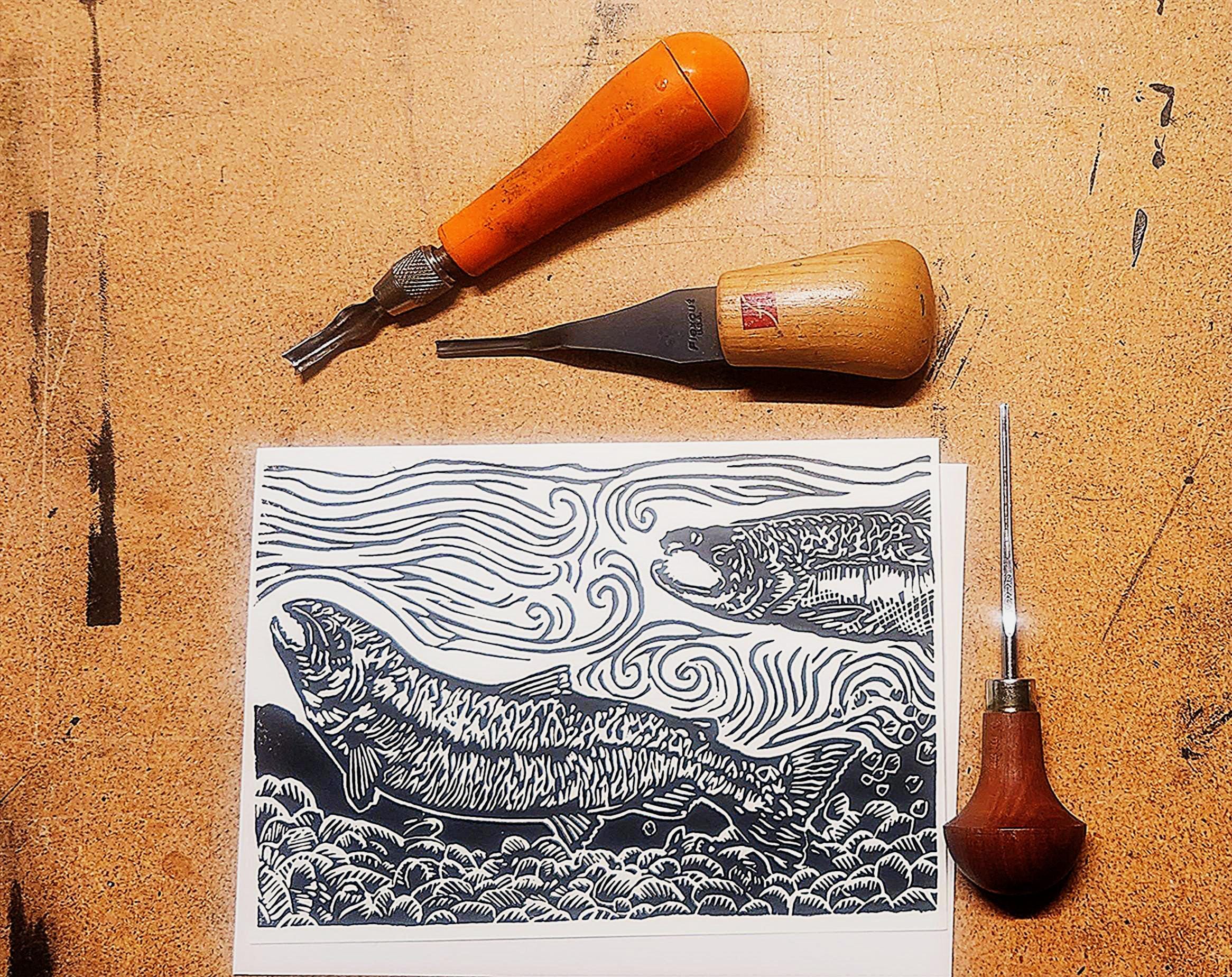 Each image begins with a drawing which I transfer to a piece of artist's linoleum (a version of the flooring material). I cut away the white areas with gouges (like small wood chisels but concave) leaving only the areas and lines intended to be black. Materials are linoleum, pencils, paper, and ink. I use sharp gouges (U-profile and V-profile) to cut the lino, then ink it up and run it through my press, or print it by hand using a baren. I draw from my science education and my volunteer experience to accurately illustrate the subject matter that I depict.
