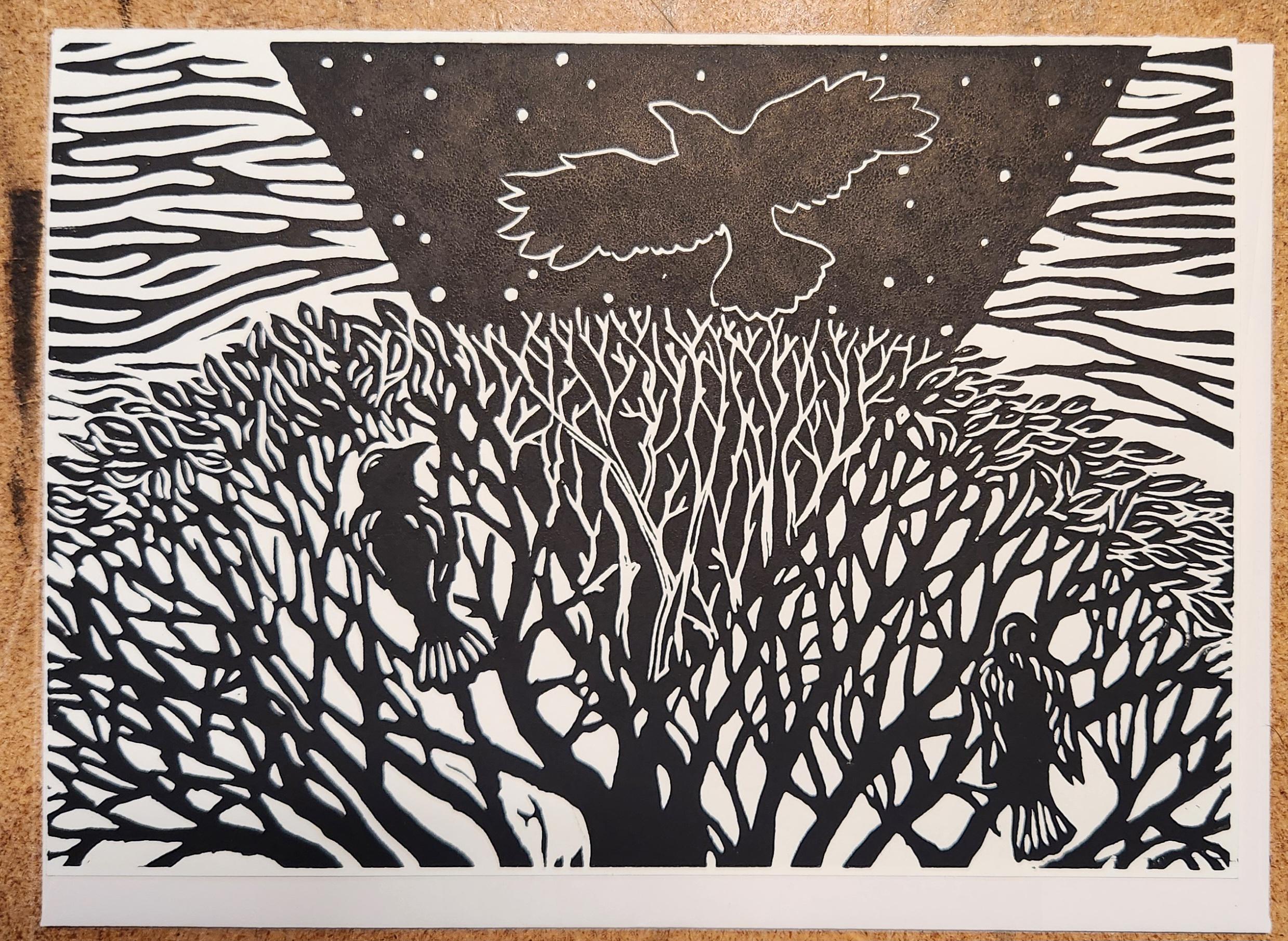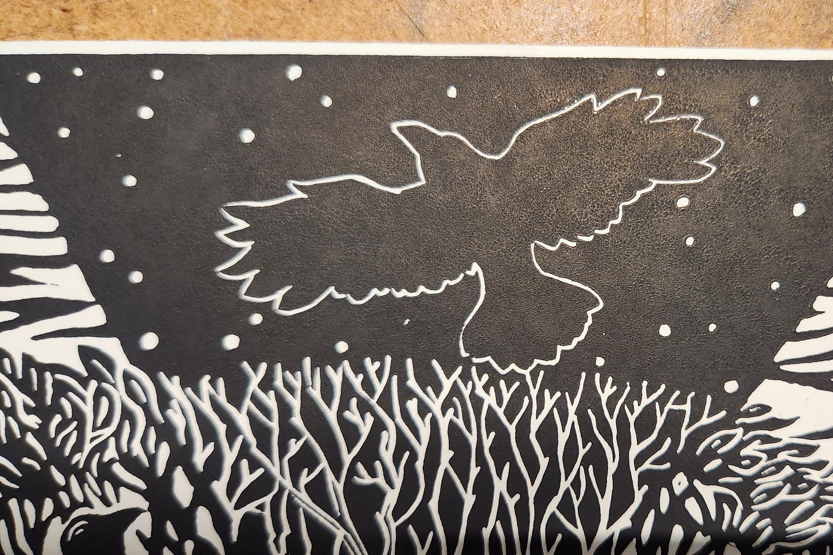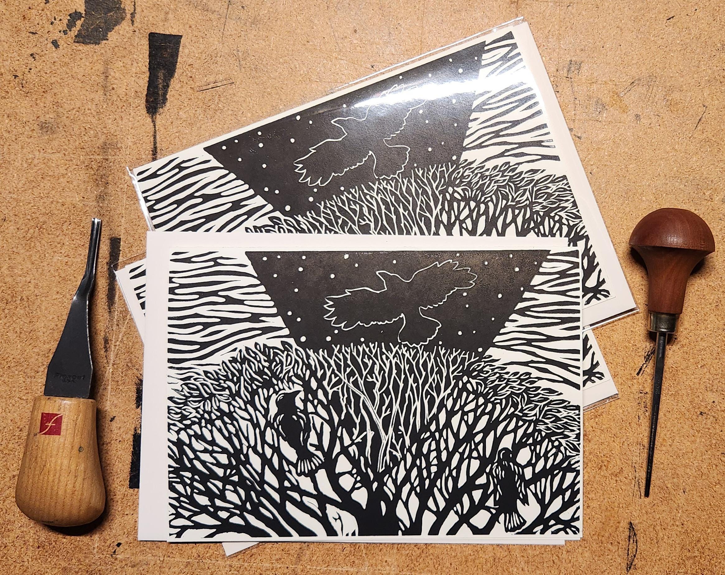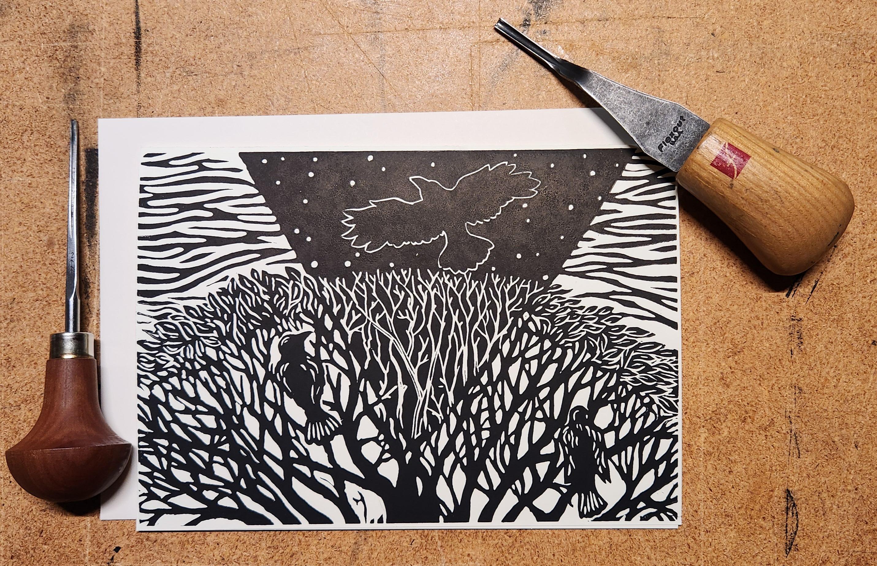 Each image begins with a drawing which I transfer to a piece of artist's linoleum (a version of the flooring material). I cut away the white areas with gouges (like small wood chisels but concave) leaving only the areas and lines intended to be black. Materials are linoleum, pencils, paper, and ink. I use sharp gouges (U-profile and V-profile) to cut the lino, then ink it up and run it through my press, or print it by hand using a baren. I draw from my science education and my volunteer experience to accurately illustrate the subject matter that I depict.