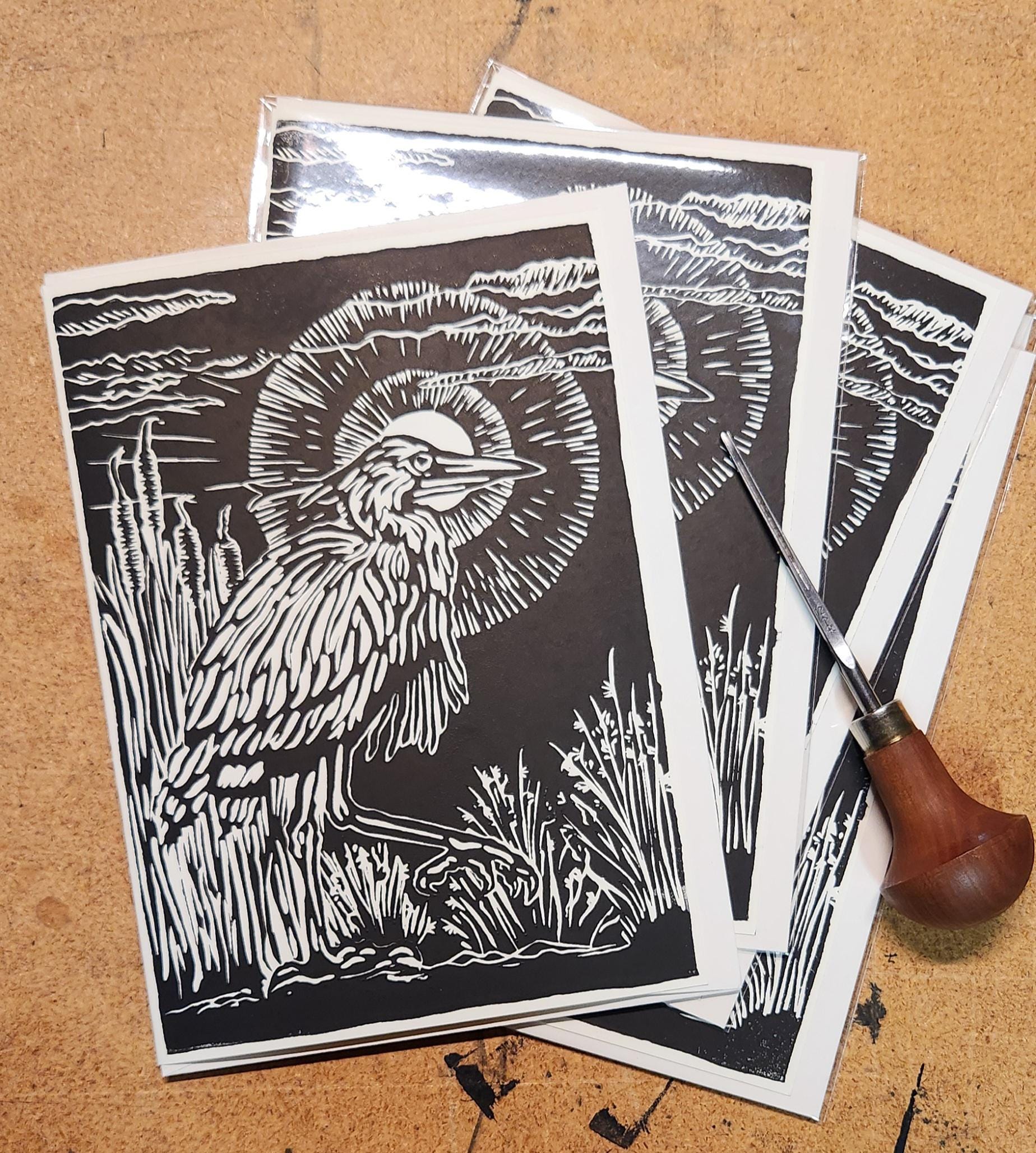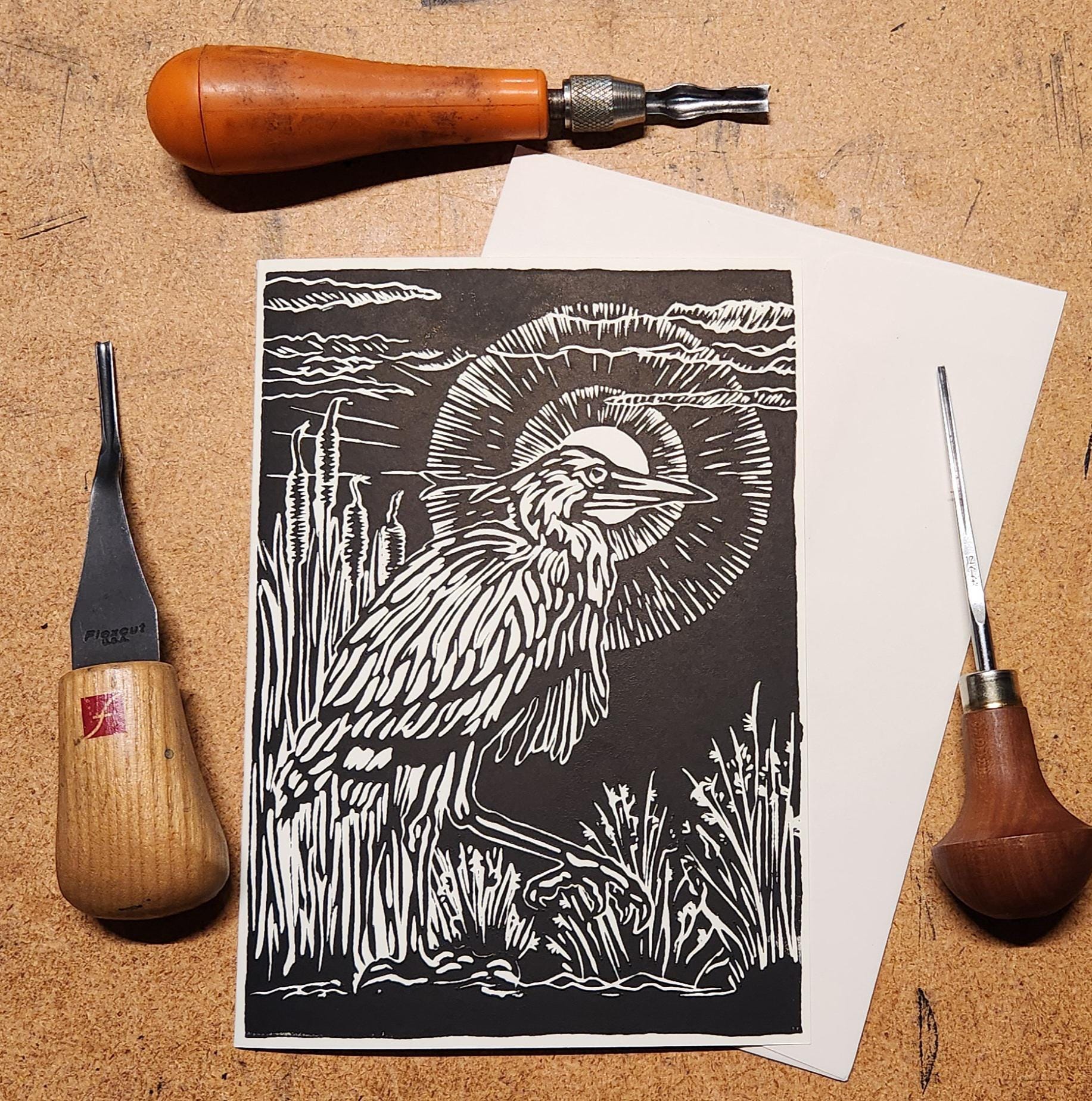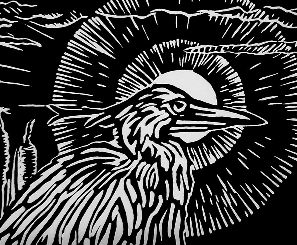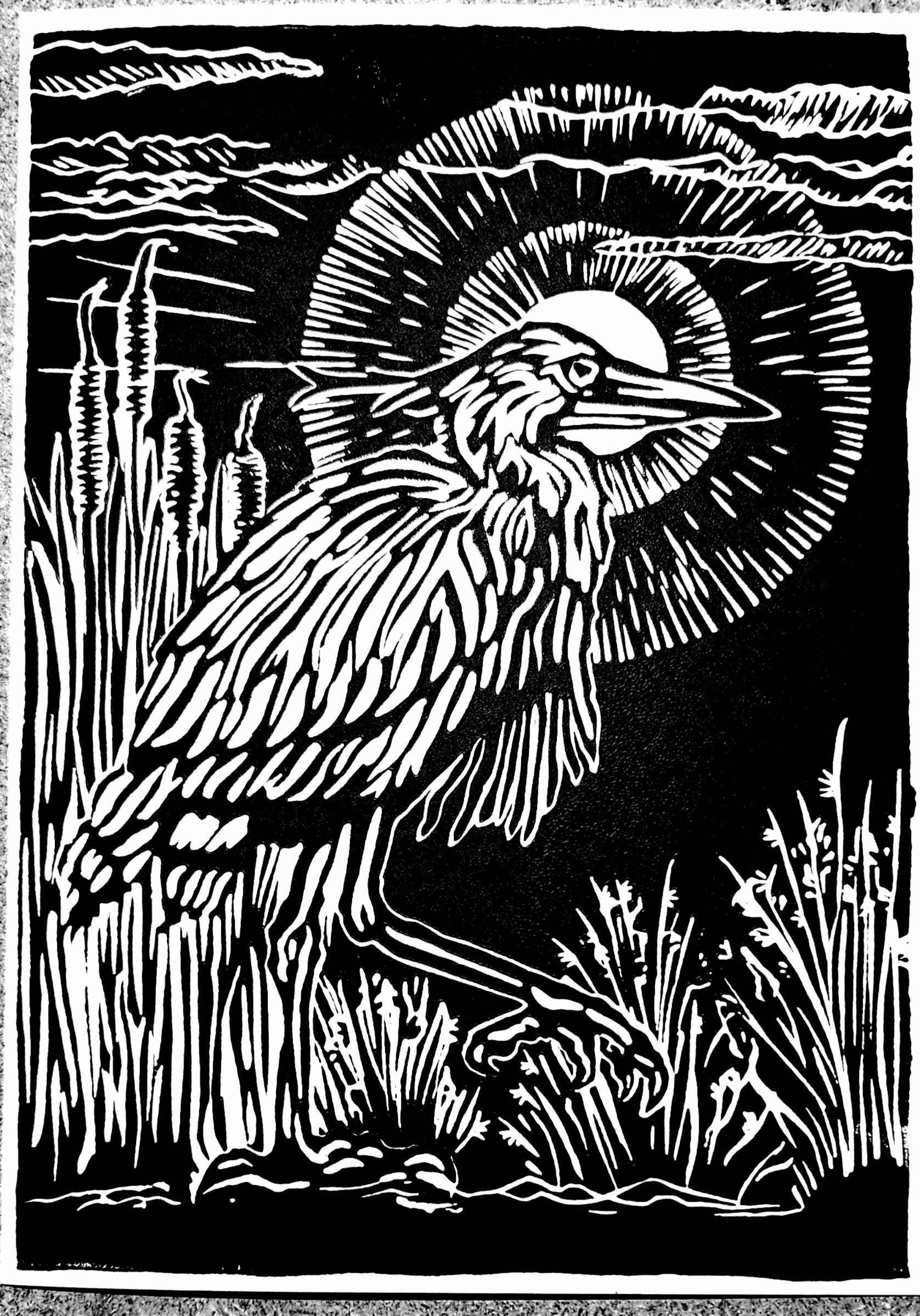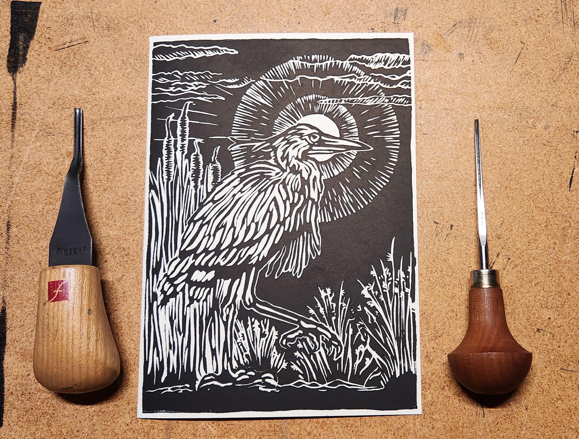 Each image begins with a drawing which I transfer to a piece of artist's linoleum (a version of the flooring material). I cut away the white areas with gouges (like small wood chisels but concave) leaving only the areas and lines intended to be black. Materials are linoleum, pencils, paper, and ink. I use sharp gouges (U-profile and V-profile) to cut the lino, then ink it up and run it through my press, or print it by hand using a baren. I draw from my science education and my volunteer experience to accurately illustrate the subject matter that I depict.