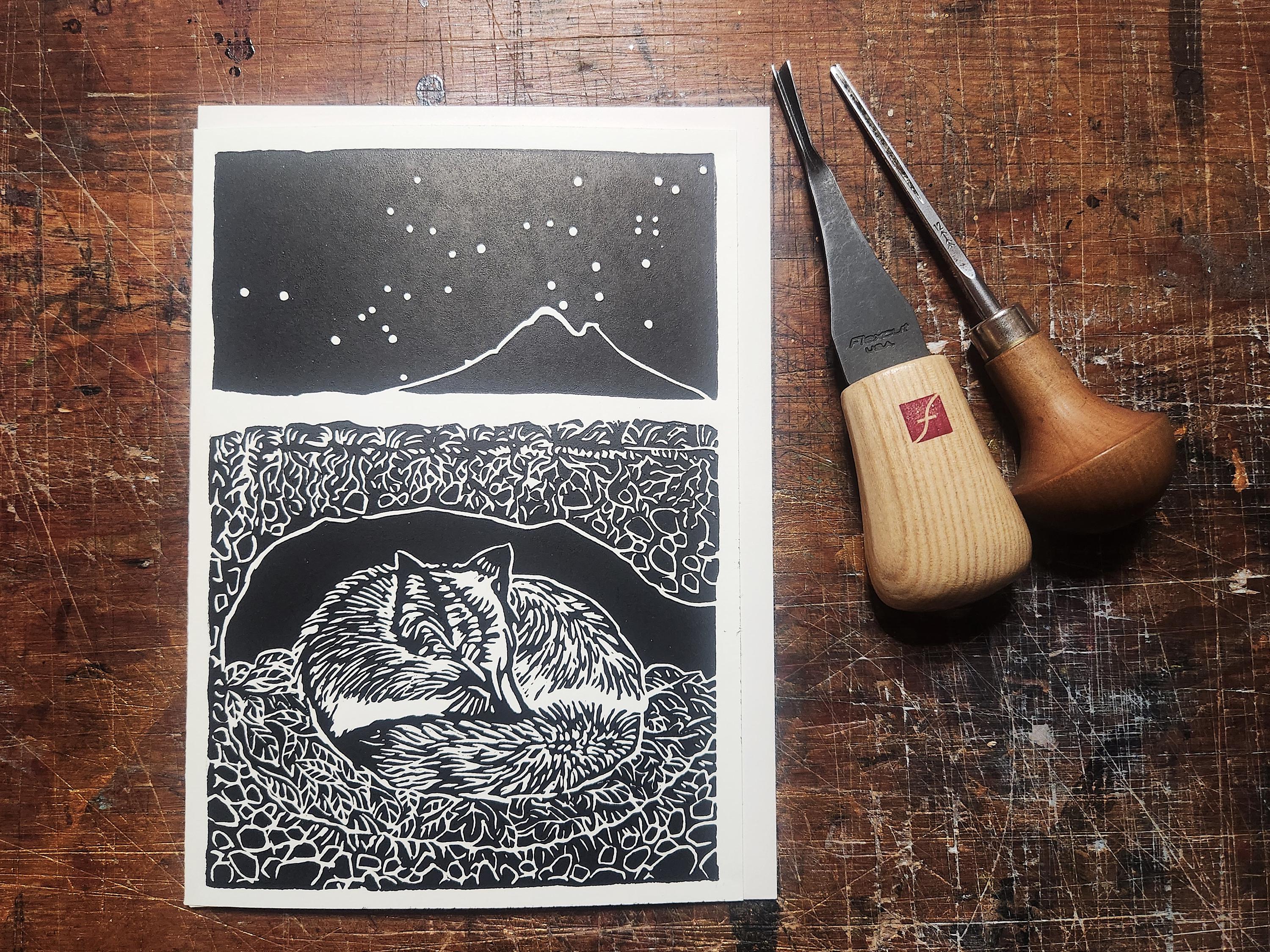 Handprinted linocut greeting card, 5" X 7" with envelope on acid-free paper. Cranfield Caligo Safe Wash oil-based ink. With cellophane sleeve.